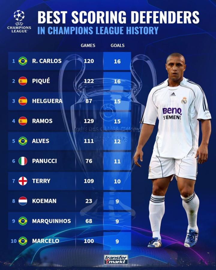 德国转会市场网站盘点了欧冠史上进球最多的后卫排行榜,其中卡洛斯和皮克并列榜首,拉莫斯排名第三。