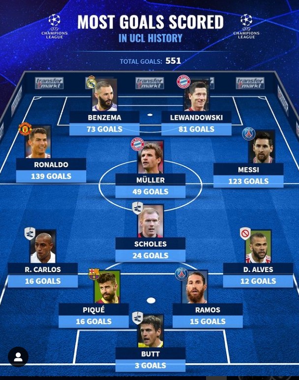 德国转会市场网站列出了欧冠历史进球最多阵容,这一阵容由C罗和梅西领衔,莱万、本泽马等人也位列其中,截至目前,11人共打进551球。