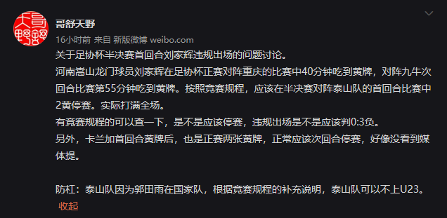 中国足球从来不缺少话题,就算在联赛支离破碎,杯赛步履蹒跚,国足世界杯出线渺茫,俱乐部欠薪丑闻频出的环境下,中国足球依然能够给球迷带来无穷无尽的讨论和话题。近日,有一位中国足球数据大神“哥舒天野”在个人社交平台发布了关于足协杯半决赛首回合中,河南队球员累计2张黄牌应自动停赛却登场的内容,一石激起千层浪让整个国内足球媒体以及球迷纷纷讨论此事应该谁背锅?甚至有极端球迷开始指责除足协、俱乐部之外的问题发现者。