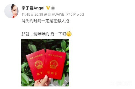 在今年七夕的时候,李子君通过社交媒体官宣了恋情,而在昨天晚上,她正式官宣领证,并写道:消失的时间一定是在憋大招,那就…悄咪咪的秀一下呗