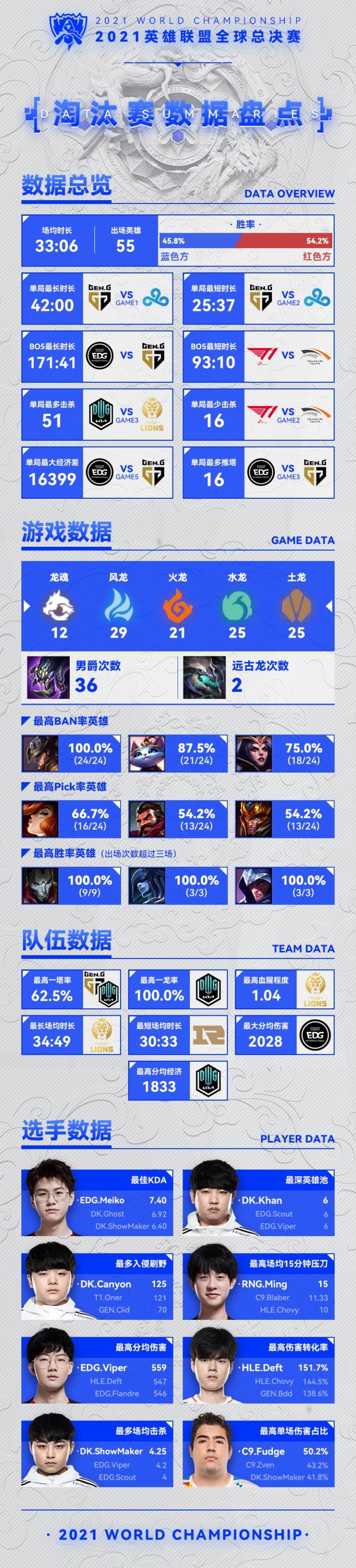 淘汰赛的场均时长为33分06秒,相比于小组赛有所缩短,其中有55个不同英雄登场,不过红蓝色方胜率差异较大,红色方高出了近十个百分点。单局时长最长和最短的比赛均诞生于GEN与C9的BO5当中,而GEN与EDG的五场大战则一共耗时171分钟,第三局更是产生了高达超过16K的经济差;T1速战速决,93分钟便解决了与HLE的战斗,第二局只有16个人头爆发,而DK与MAD的比赛比想象中血腥,其中第三局爆发了51个人头。
