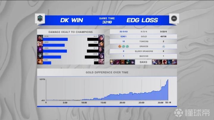 第31分钟,EDG强势绕后开团,玛尔扎哈交出闪现金身拖延时间,DK支援赶来后直接团灭EDG,DK扳平比分!