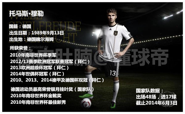 “穆勒”这是我们最熟悉的一个德国姓氏,同时这个姓氏也是贯穿德国足坛历史的姓氏,上世纪70年代的传奇盖德•穆勒,上世纪90年代的球星安德雷斯•穆勒,以及现役德国队球员托马斯•穆勒。这位被中国球迷称为“二娃”的球星,有着天生的幽默感,在场下他是球队里欢乐的来源,在场上,他的大心脏屡屡让他在大赛中有着神奇的表现。
