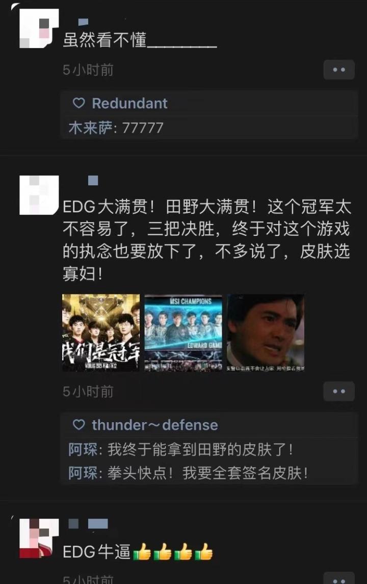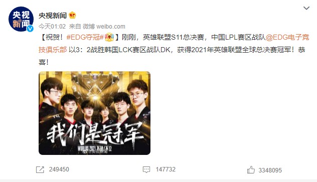 总而言之,无论你身在何方、处于什么样的年龄、从事着怎样的行业,只要在今天的这个时间打开任何一处社媒、网页,你就不可避免地会被上述的诸多信息刷屏,最终主动或被动地记住这样一件事:一个名叫EDG的战队,今天夺冠了。
