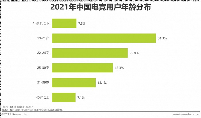 同样根据数据,2020年中国电竞用户规模达到5亿,其中以19至21岁的群体占比最高(31.3%),18岁以下至24岁的国内电竞用户占比达到61.4%,整体趋势不仅稳步提升,还在趋于年轻化。
