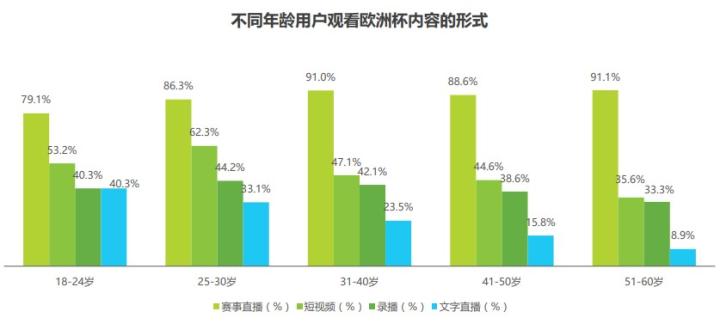 年龄差异所带来的还有收看比赛习惯的不同,据统计,18-24岁的欧洲杯观赛用户中,习惯于熬夜收看比赛直播的用户占比为79.1%,这一比例在所有年龄段中排名末位。而30岁以下的群体,相对更乐于接受通过短视频平台观看足球比赛的方式。时差问题给年轻人观看足球比赛直播带来了又一道门槛,而在如今的网络时代,一场90分钟的足球比赛是否真的显得太长了呢?