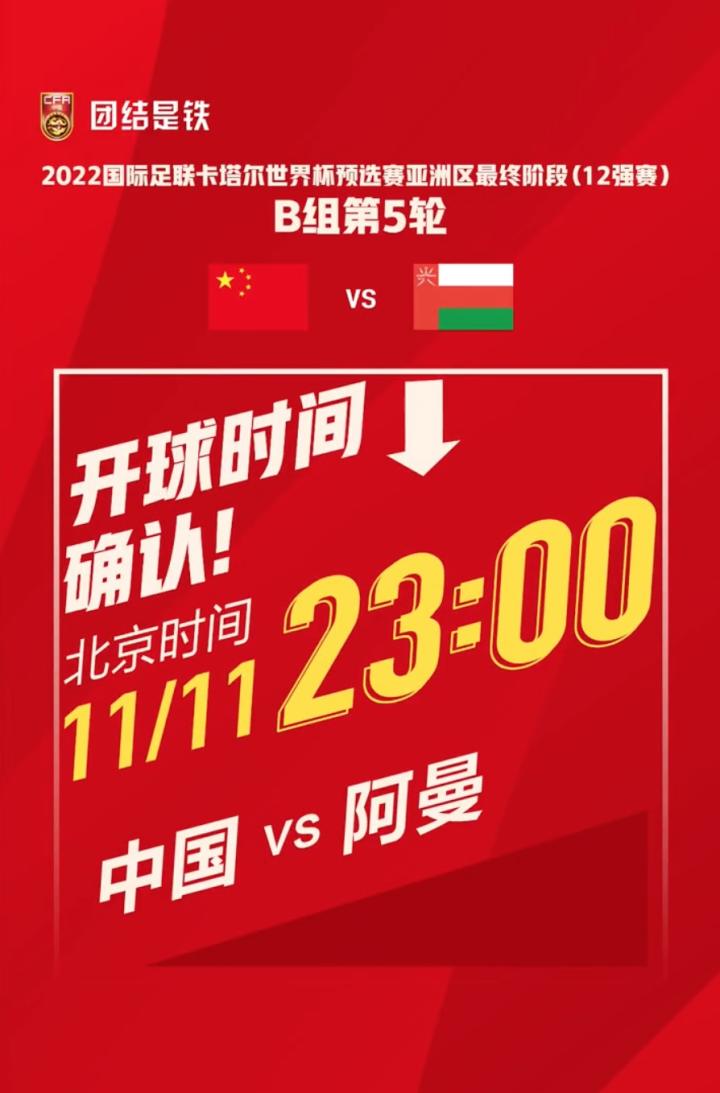 中国足协官方账号足球中国发布的海报显示,国足将在北京时间11月11日,23:00迎战阿曼。尽管此前亚足联已经在官方赛程公布了中国战阿曼以及澳大利亚的开球时间,但有媒体报道,考虑到当地的气候,国足可能会争取在晚些时间开球。