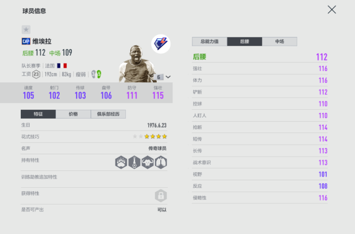 游戏中的维埃拉与古利特一样,属于“神兽”之一,区别在于维埃拉在实战中防守能力更突出,站位非常稳定,所以很多玩家甚至会把他放到中后卫位置上搭档马尔蒂尼。很多时候你会发现维埃拉的跑动并不算勤快,但他的位置感极佳,总是能够在关键位置上伸出大长腿拦截对手的出球。相比较而言,维埃拉的进攻能力并不突出,无论是禁区射门还是远射都缺乏威胁。各赛季的维埃拉实战效果想差不大,目前来看最常见的还是LH赛季金卡与ICON赛季,这张队长赛季的优势在于“铁肺”特性,在落后时更加积极。建议玩家根据阵容工资来选择维埃拉的不同赛季卡