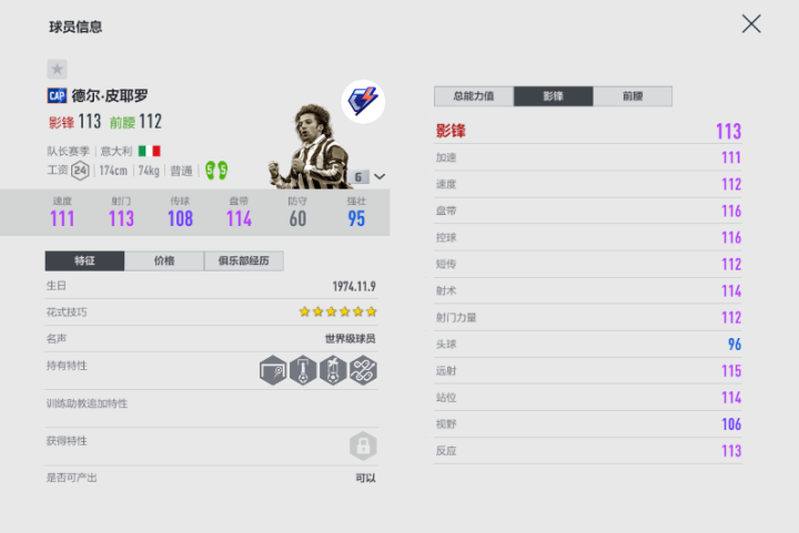 游戏中的CAP皮耶罗能力值仅次于ICON赛季,他在实战里的最大优势就是双五脚以及出色的盘带、控球能力,再结合六星花式,能够作出许多行云流水的过人动作。除了带球的流畅度之外,他的射门也是相当精准,无论是单刀低射还是禁区外ZD搓射都非常有把握。或许在传奇套中,ICON皮耶罗只能算是高性价比的球员,无论是速度还是身体素质都不占优势,但这张CAP皮耶罗的高强卡并不逊色于传奇银卡,在队套中放在前腰和二前锋位置能够发挥其手感出色、远射能力强,以及转身出球速率快的优点,有着不错的进球效率。
