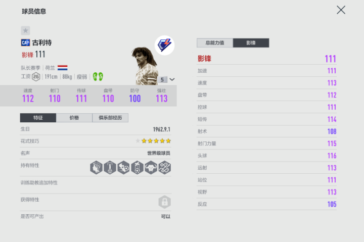 游戏里的古利特可以说是出场率最高的球员,甚至没有之一,因为他在前场和中场的各个位置都有绝对的统治力。这张队长赛季的古利特位置更偏向前场进攻型,而同样最新推出的切尔西大使赛季在防守方面更出色,总评最高的20WL赛季各方面更全面。从实战效果来说,CAP古利特和其他赛季卡一样,是标准的六边形战士,在身体对抗上有得天独厚的优势,而作为前腰来说无论是后插上头球,还是接应后的远射,都有着极高成功率,再加上他的模型,绝大多数中场都难以逾越古利特这道关。