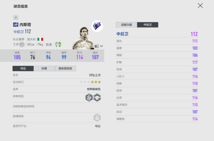 游戏里的内斯塔却没有那么热门,主要还是由于实战时转身速率偏慢,而当前版本速度型前锋非常吃香,结合双灯助教的提前启动往往能把双速较慢的中卫甩在身后。内斯塔的优势还是在于防守站位好,而且铲断准确性高,很多时候在对方持球队员背后的铲球也没有犯规。从各赛季对比来看,LH内斯塔无论属性还是性价比都占据相当大的优势,特别是在强壮、抢断和反应上,而CAP赛季的积极性更高一些。同能力值的CAP赛季与EBS赛季相比,后者的双速和强壮也是略高一筹,所以,这张队长赛季内斯塔优势不大,如果之后市场价位合适的话可以入手。