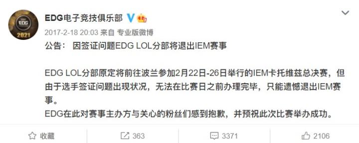 17年2月份,获得去波兰参加IEM总决赛的资格的EDG却在赛事开始前几天在微博发公告,称因为签证问题无法前往波兰。