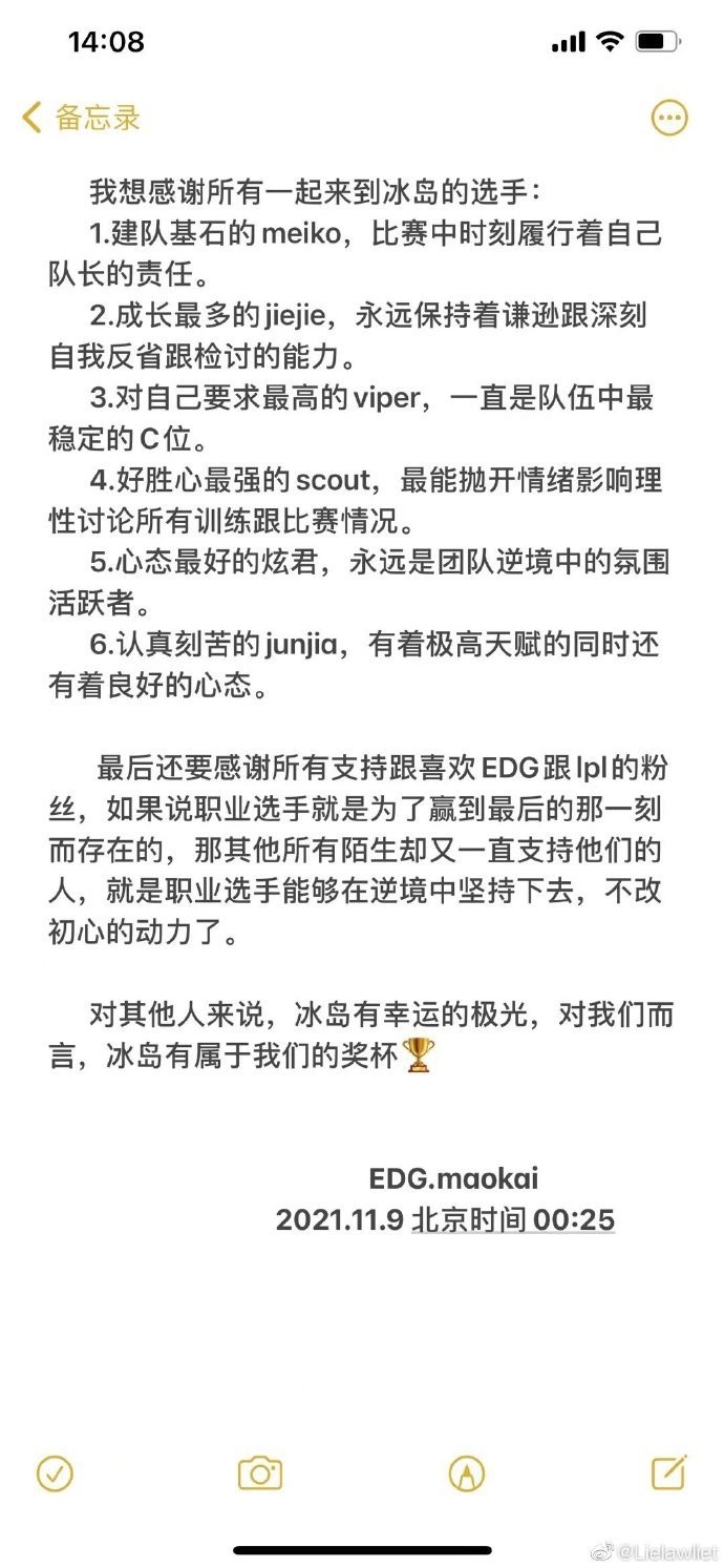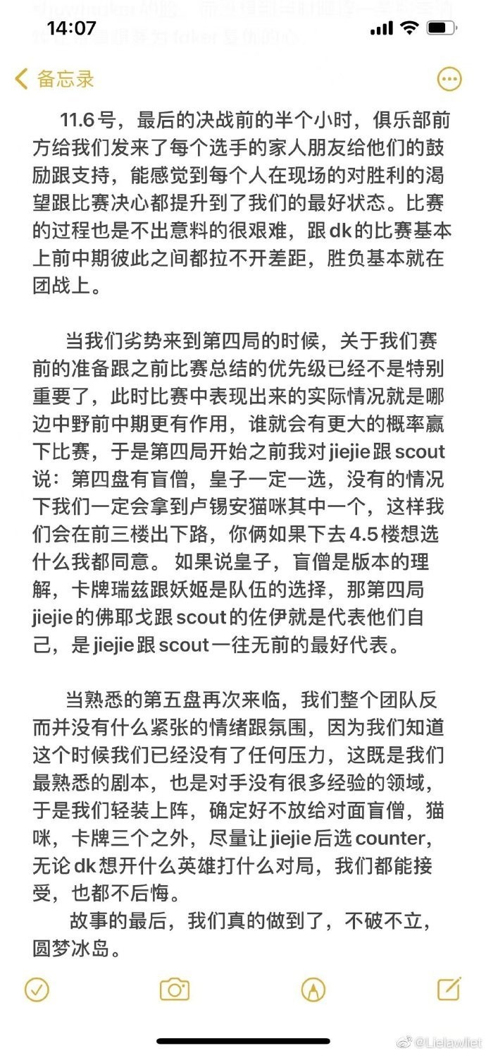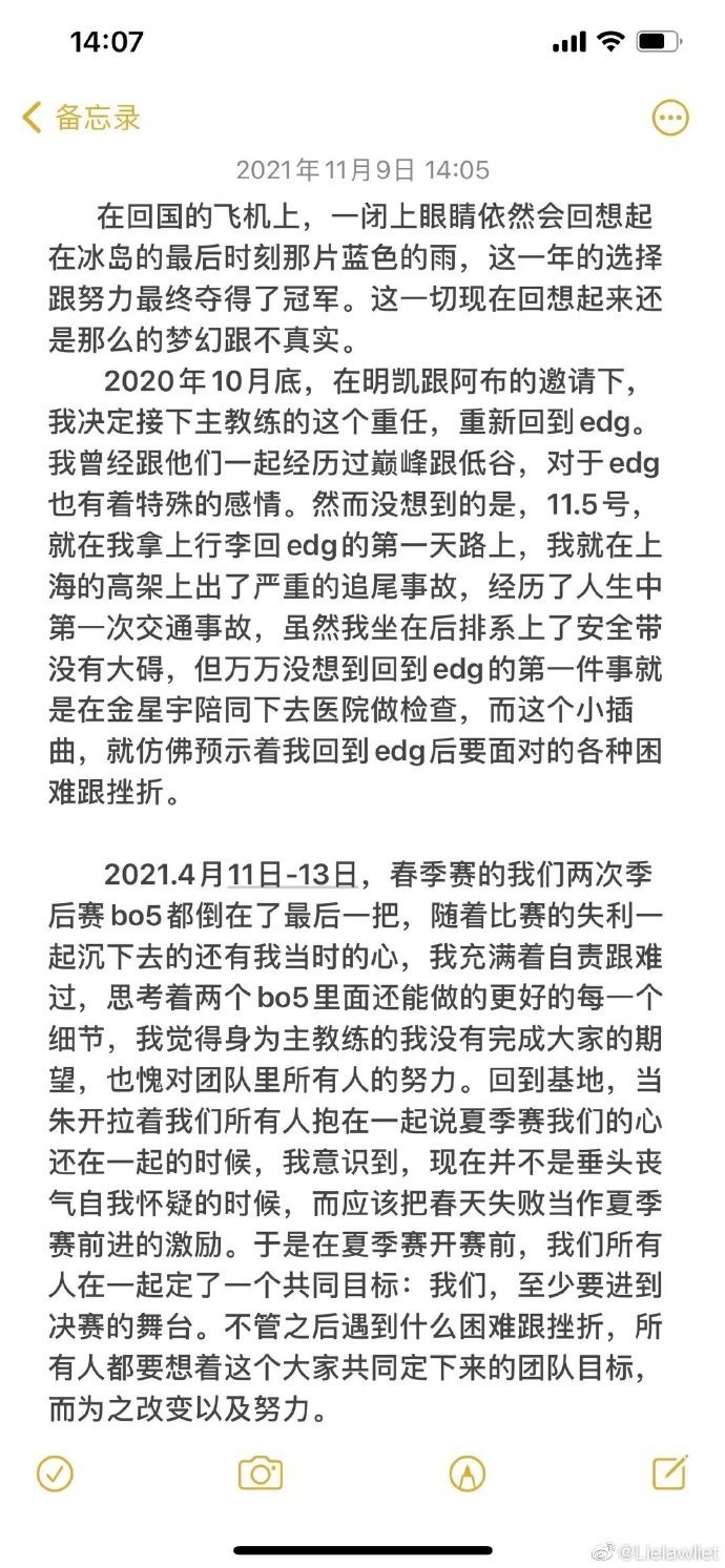 峡谷全视野11月7日,英雄联盟S11世界赛LPL战队EDG战胜DK勇夺S11冠军!近日EDG冠军教练茂凯在朋友圈发布了赛季回顾。