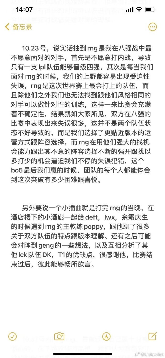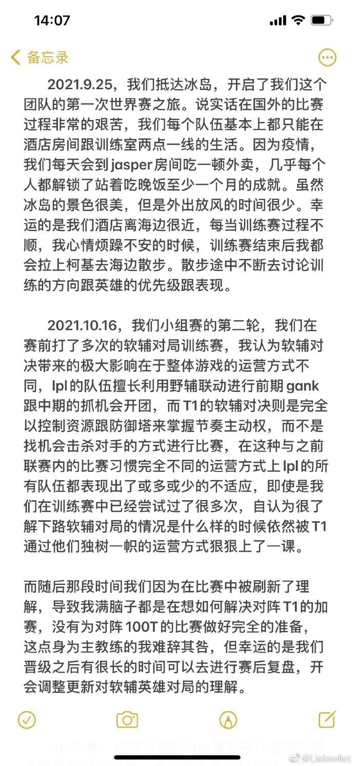 茂凯教练详细地描述整个S11赛季以来在EDG经历的种种事件的心得体会,以及感谢了各位同行对自己提供帮助与支持。感谢厂长,会在比赛结束后跟我讨论接下来面对不同对手时BP的最优解,也会指出我们队伍比赛中最严重的失误。其中也透露到EDG与DK一共打了34场训练赛。无论蓝色方还是红色方胜率都比他们高。不太明白ShowMaker想要决赛3-0我们的自信从何而来。