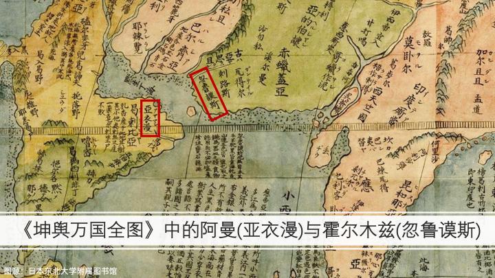 我国在唐宋两朝和阿曼都有民间交流,有位名叫“辛押陁罗”的阿曼商人还被宋神宗封为“归德将军”,郑和下西洋时也曾3次到访阿曼。明朝万历年间绘制的《坤舆万国全图》把阿曼称为“亚衣漫”,把“霍尔木兹”标注为“忽鲁谟斯”,这是我国第一幅完整的经纬世界地图,可以清楚地看到北回归线横贯阿曼,所以阿曼大部分的领土属于热带,只有少部分地区属于北温带。