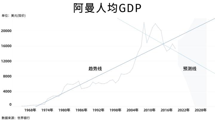 这一点在人均GDP的体现中更为明显,2008年全球金融危机之前的阿曼,其人均GDP已经达到22139美元,已经被世界银行列为高收入国家。但由于国内经济震荡以及阿曼人口的持续增长,人均GDP在2019年已经跌至15000美元,而2019年高收入国家的门槛线是12536美元。如果我们加入两条参考线,可以发现虽然阿曼的人均GDP在整体上是上升趋势,但以最近十余年的数据做预测的话,未来可能将持续下跌。