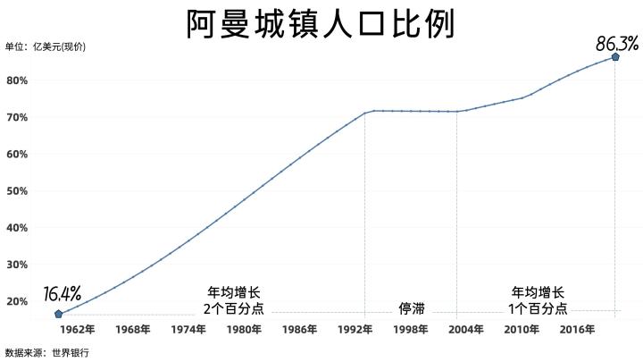 目前阿曼的城镇人口已超过了86.3%,进入了城市化的尾声阶段。值得关注的是,阿曼的城市化在1991年的海湾战争之后到2003年的伊拉克战争期间,曾有一段十几年的停滞期,具体原因尚且不知,有知情的朋友可以在评论区提出来。