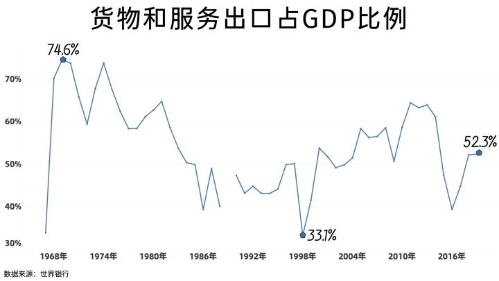 说到石油,就不得不提阿曼的经济构成,这个沙漠和山地占据大多数的国家,发展农业是没有自然条件的,而较低的工业化水平和较为丰富的油气储藏量让他们成为一个以能源为主的出口导向型国家。出口对阿曼来说有多重要呢?其国内生产总值最高曾有74.6%都来自出口,历年平均水平也超过50%。
