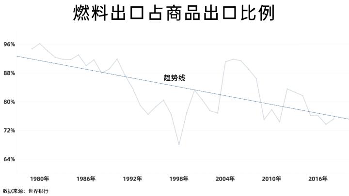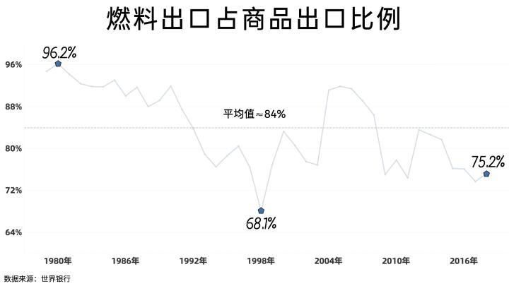 最惊人的时刻是在1980年,阿曼出口的商品中超过96%都是包括原油、精炼油和天然气在内的燃料制品,历年的平均值也在80%以上。