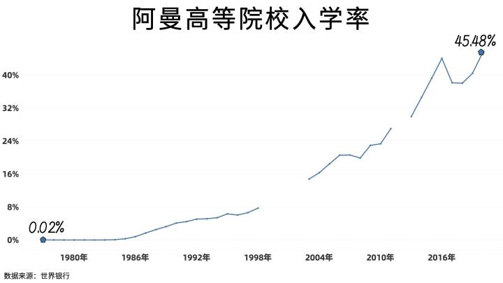 在阿曼人逐渐富裕的过程中,他们对教育是比较重视的,高等院校入学率已经达到45%,不过这个数字也并不算很高,因为我国是58%,美国约88%。