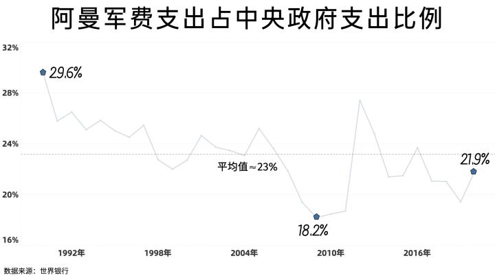 阿曼的军费支出常年超过政府总支出的20%以上,而特朗普时期的美国,军费支出占比都没超过10%,英法德等欧洲国家那就更低了。阿曼的军费水平较高并不能说它是一个穷兵黩武的国家,在沙特组织的多国联军干预也门内战的军事行动中,阿曼是海湾阿拉伯国家合作委员会成员国中唯一一个没有派军参与的。