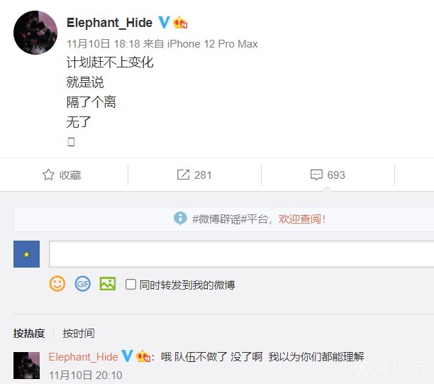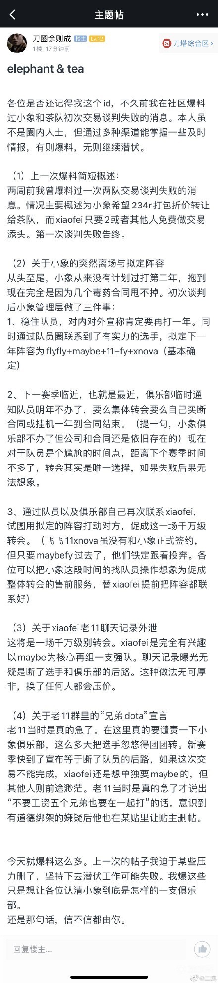 在10月24日小象战队领队还曾辟谣解散传言,也就是老爆料人“刀圈余则成”发布的消息。