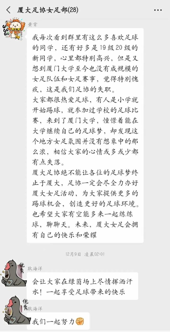 不久,一个名为“厦大足协女足部”的微信群就建立了起来,虽然群里只有12个人,这足以让蹒跚起步的足协感到欣慰。