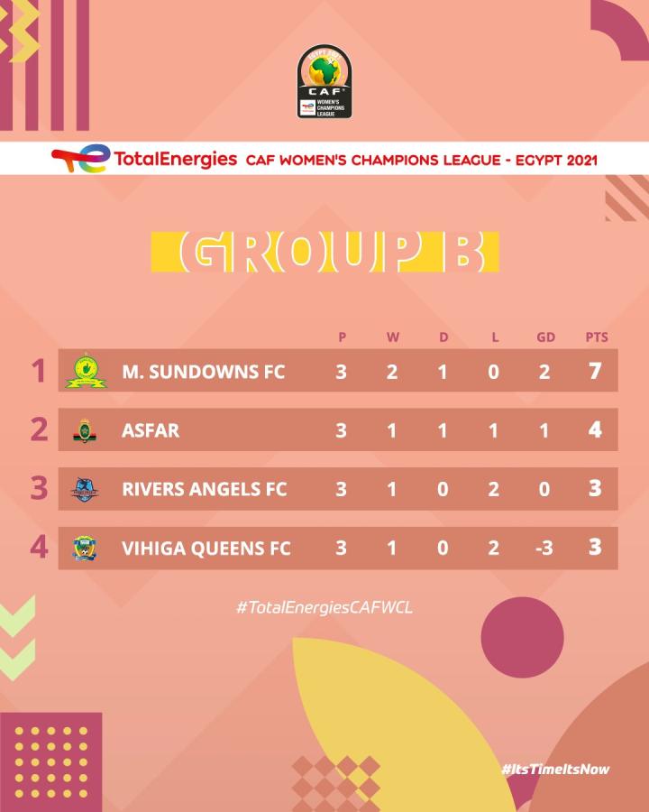 B组最终积分榜:此前两连败、零进球的河流天使本轮四球大胜,积分追平韦希加皇后,并以净胜球优势超越对手来到第三;马梅洛迪日落、拉巴特皇家武装打平各得一分,携手晋级四强