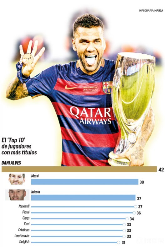 西班牙《马卡报》盘点了生涯冠军数量最多的球员排名,阿尔维斯以42个冠军排名第1,梅西(38个)排名第2,伊涅斯塔和马克斯维尔(37个)并列第3。