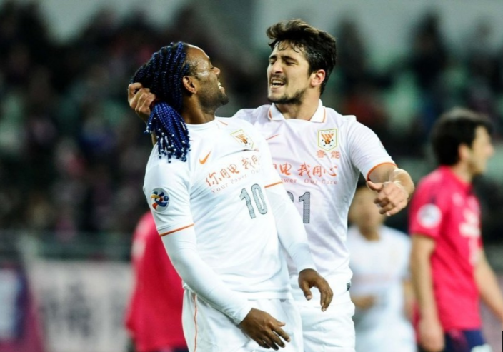 (图)大阪樱花1:3山东鲁能,洛维与阿洛伊西奥庆祝进球