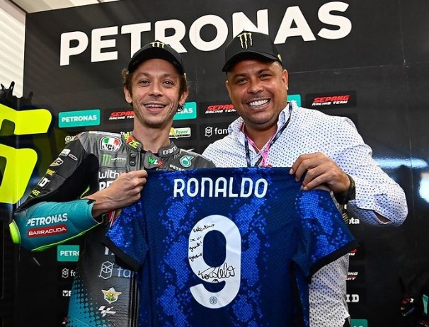 国际米兰官方晒出了瓦伦蒂诺-罗西和俱乐部传奇射手罗纳尔多的合影,两人共同拿着印有罗纳尔多名字的国际米兰9号球衣(这是“外星人”罗纳尔多赠送给瓦伦蒂诺-罗西的特殊礼物),配文写着:“从一个现象级到另一个现象级。”