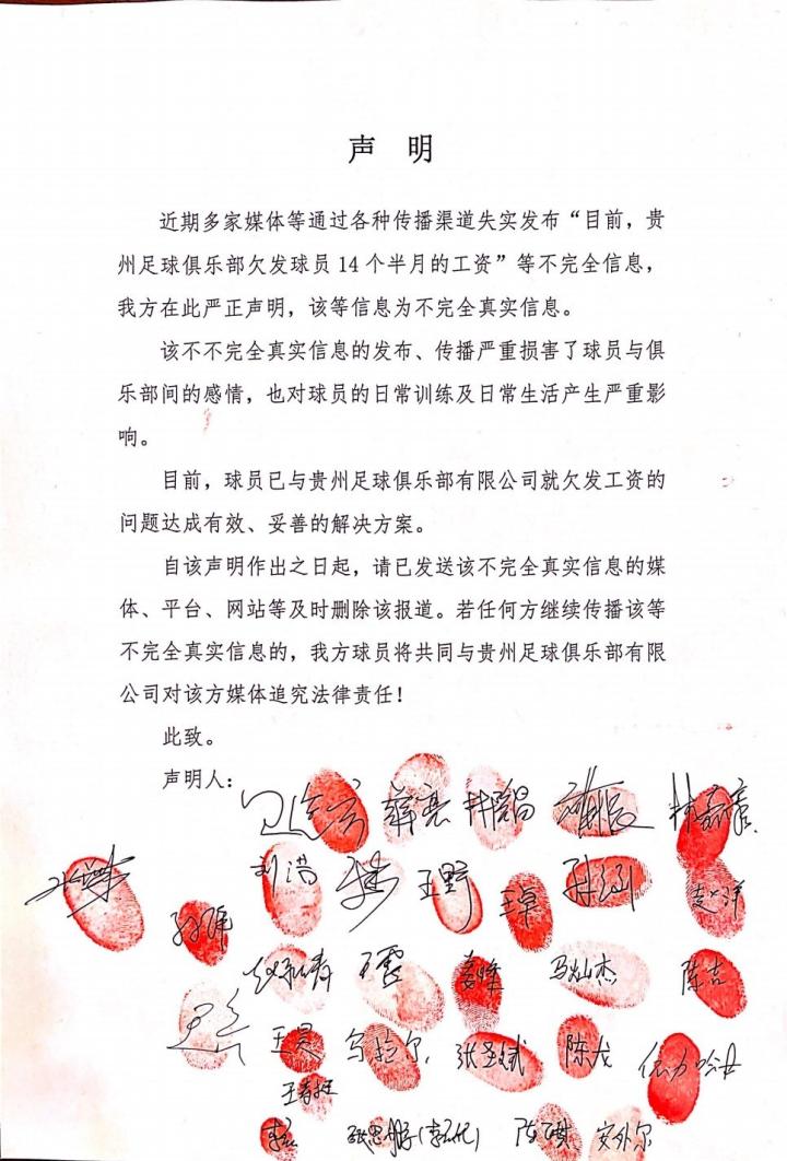 贵州队已与球员就欠发工资达成妥善解决方案,球员按手印声明