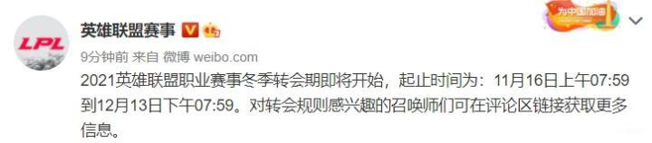 2021英雄联盟LPL冬季转会期起止时间为:11月16日到12月13日 峡谷全视野 峡谷全视野2021-11-15 20:56LPL官方:2021英雄联盟职业赛事冬季转会期即将开始,起止时间为11月16日上午07:59到12月13日下午07:59。对转会规则感兴趣的召唤师们可在下面比赛规则链接获取更多信息。相关阅读【英雄联盟职业联赛比赛规则(2021.11版)】展开更多