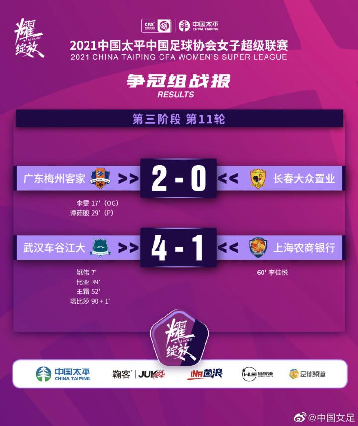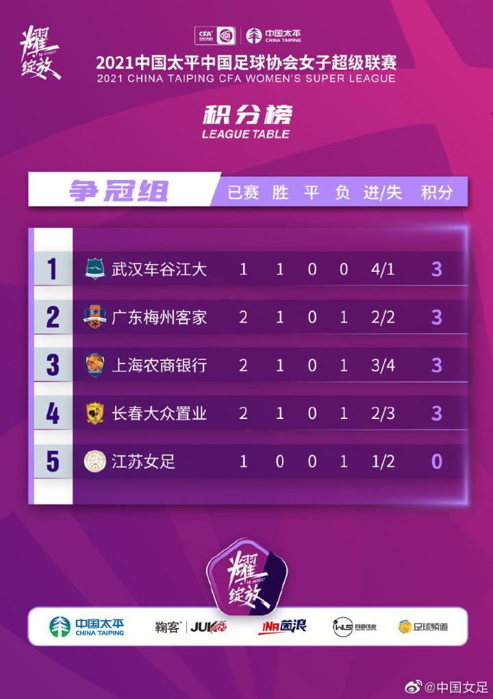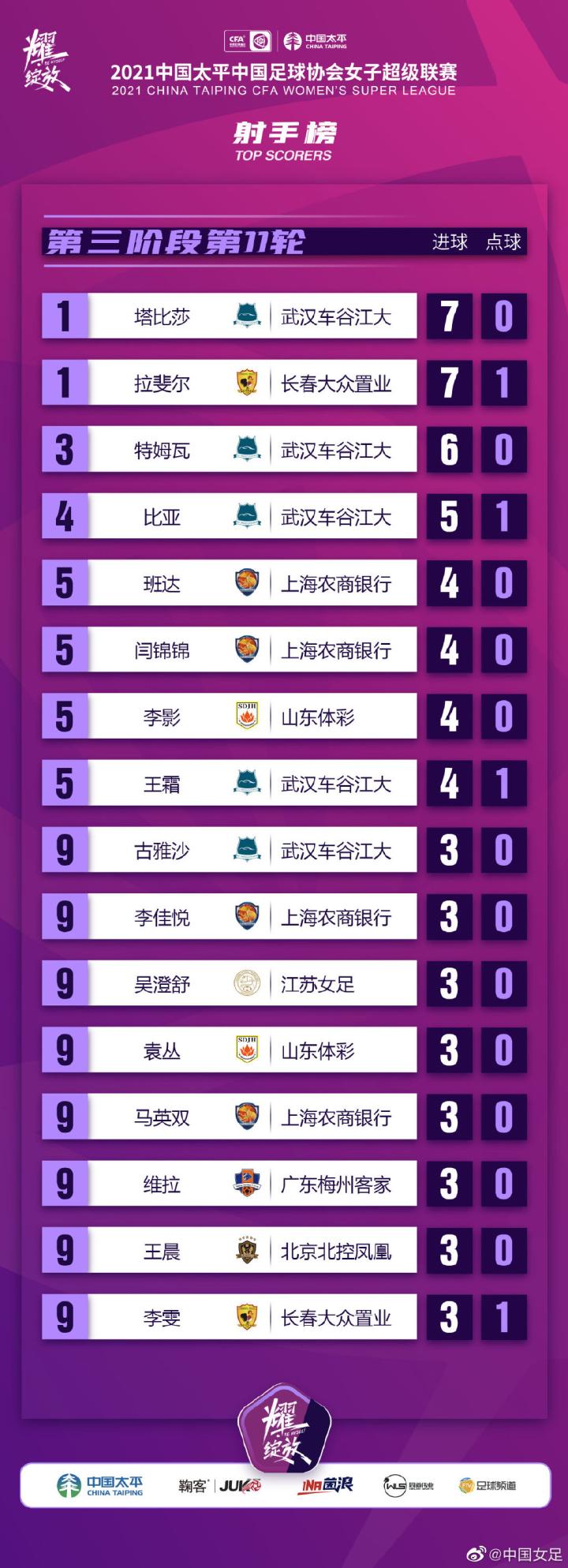 11月16日晚,中国女足官方发布了2021赛季女超联赛争冠组第2轮赛果,以及赛后积分榜、射手榜。 本轮,武汉车谷江大4-1大胜上海农商银行;广东梅州客家则2-0完胜长春大众置业。本轮过后,4支球队同积3分,武汉车谷江大凭借净胜球优势位居榜首。本轮轮空的江苏女足因为首轮不敌长春大众置业,所以暂时垫底。 射手榜上,武汉车谷江大球员塔比莎、长春大众置业球员拉斐尔,均取得7个进球,共同领跑。武汉车谷江大特姆瓦、比亚分别取得6个、5个进球,分列第3、第4。上海农商银行班达、闫锦锦,山东体彩李影,武汉车谷江大王霜,各自取得4个进球,并列第5。