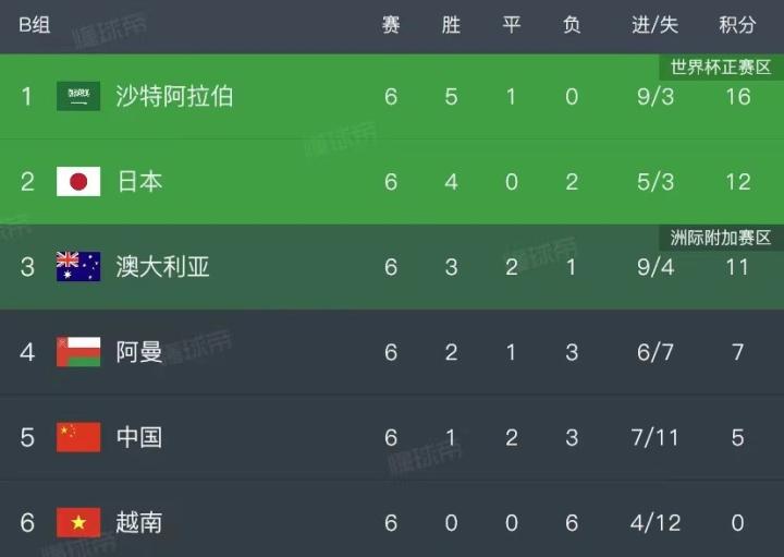 【12强赛B组最新积分榜:国足仍排名第5,日本反超澳洲升至第2】
