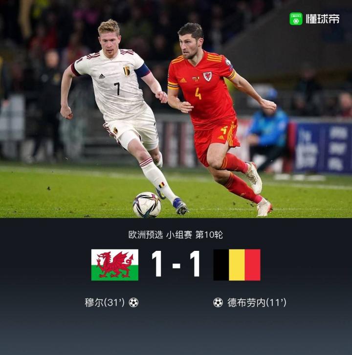【威尔士1-1比利时以小组第二进入附加赛,德布劳内、穆尔破门】