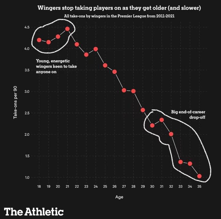 不过,如果要从球员风格的角度来看,每个位置需要考虑的数据都不同。例如,下图统计了英超各年龄段边锋他们每90名边锋平均有多少次过人(引自Colin Trainor所统计的数据)。