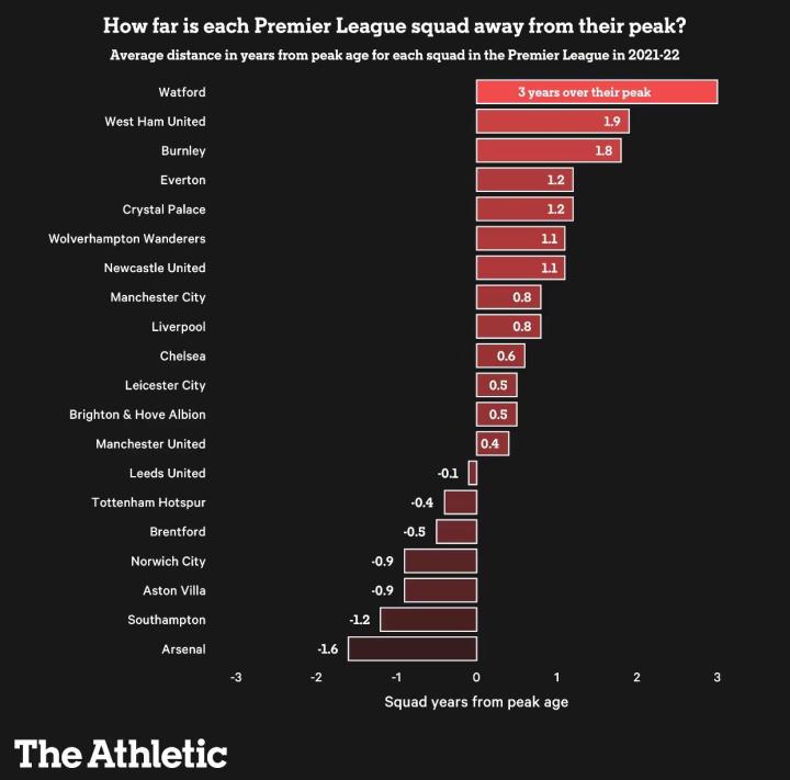 阿森纳是一支特别需要考虑的球队,因为考虑到本赛季所有在联赛中踢过400分钟或更久的球员,阿森纳队平均距离达到巅峰期还有1.6年的时间,是联盟中最低的球队,几乎是阿斯顿维拉两倍(距离他们理论上的巅峰还有0.9年)。另一头是沃特福德,他们最常见的首发球员平均比巅峰时期晚了3.0年,当然也很可能是被38岁的老将本·福斯特“拖了后腿”。
