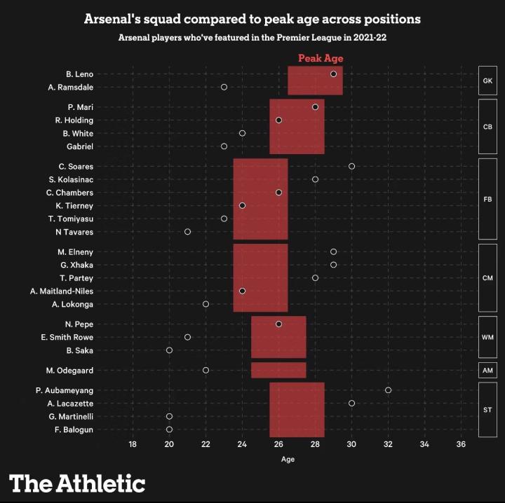 通过此数据,可以构建更自定义的阵容配置侧写,从而显示出更合适球队的峰值年龄波段。以下以现在的阿森纳作为例子, 他们在球场上有很多早期巅峰球员。