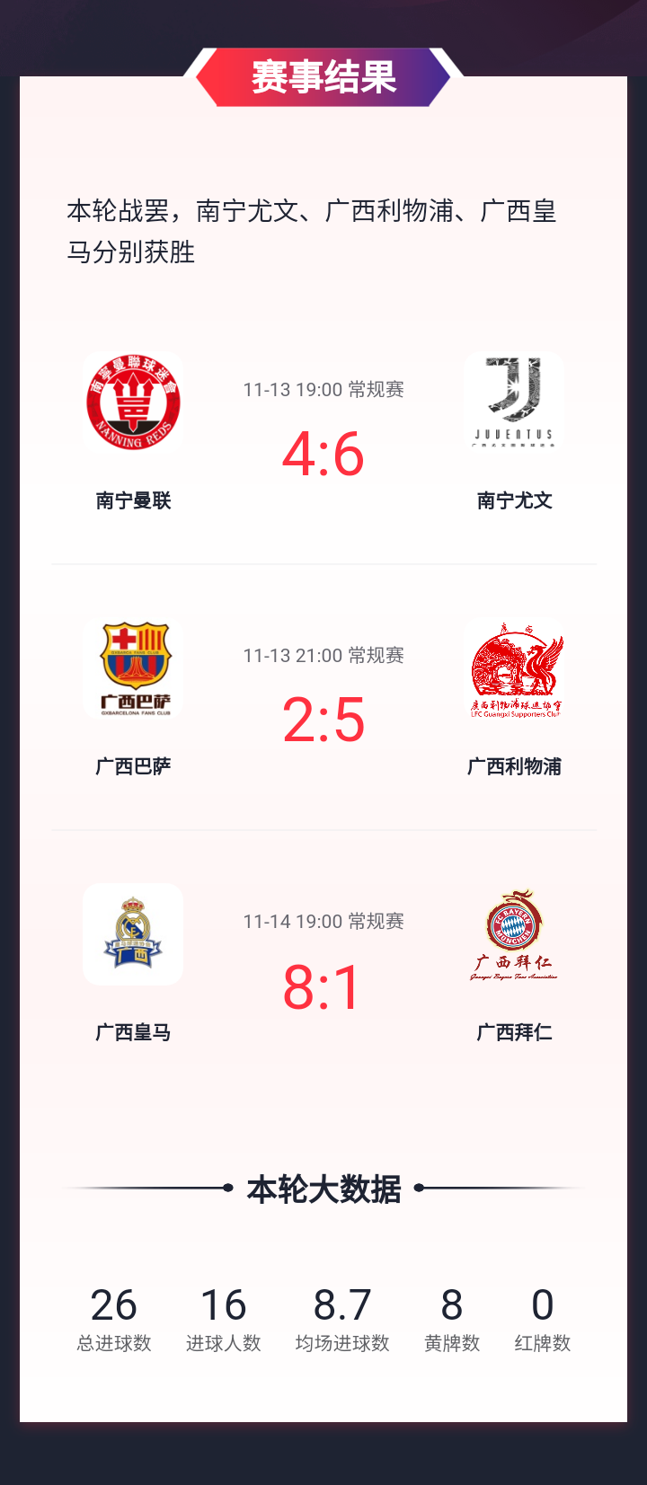 11月14日19:00,广西豪门杯第五轮,卫冕冠军广西皇马对阵广西拜仁,双方实力有较大差距,广西皇马的91号彭耀辉上演帽子戏法,陆炫辰梅开二度,冯烨、黄鹏、林浩各入一球,广西拜仁由郭君扳回一分,最终广西皇马8-1广西拜仁,排名积分榜第三名。