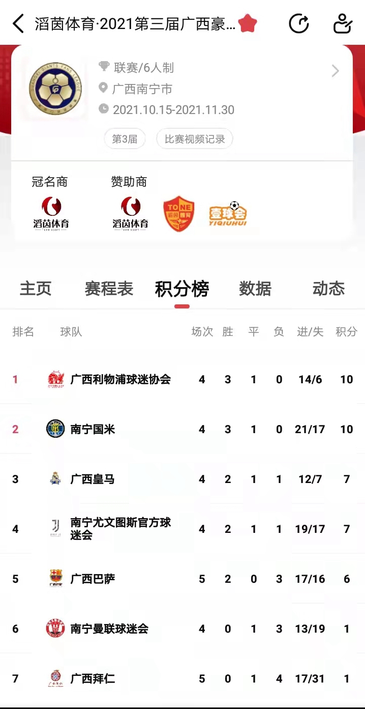 耀武酒肆工作室11月13-14日,2021滔茵体育.第三届广西豪门球迷足球联赛(豪门杯)第五轮战罢,南宁尤文大逆转南宁曼联,广西利物浦击败广西巴萨,广西皇马大胜广西拜仁,争冠球队犬牙交错,竞争激烈。