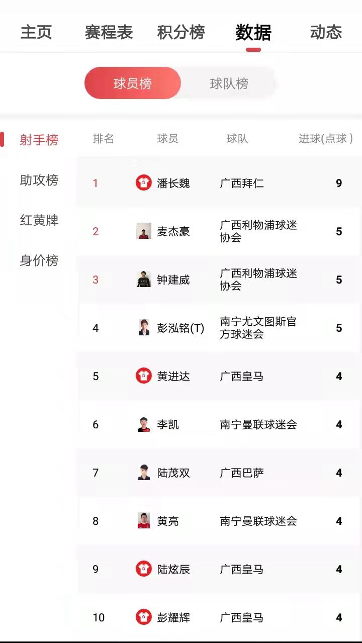 广西豪门杯第五轮总计打入26球,场均8.7球,大开大合场面奔放。广西利物浦和南宁国米同积分积10分,广西利物浦以净胜球的优势排名榜首,同积7分的广西皇马、和南宁尤文紧随其后。射手榜方面,潘长魏本轮没有斩获但依然以9球排名榜首,攻入5球的钟建威、麦杰豪、彭泓铭在第二名的位置蓄势待发。
