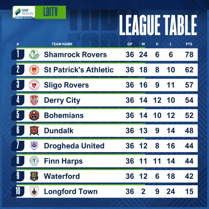 沙姆洛克流浪,圣帕特里克竞技,斯莱戈流浪,德里城和波希米亚人分列一至五名,下赛季将参加欧战比赛。