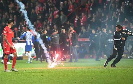 11月2日晚,赫塔球迷集体大张旗鼓的来到了柏林联合的主场,赛前警卫部署的十分森严。柏林克珀尼克区,老林务所畔球场的上空烟雾弥漫,赛前双方的火爆气氛似乎吹一下就可以燃起来。当主裁判开哨不到一分钟,就因双方球迷向场内倾倒垃圾过多而暂停,而之后的十分钟,狂热的赫塔球迷更向场内投掷了烟花,导致比赛被二次暂停,烟花弥漫的老林务所畔对于球迷来说已经像炸锅了一般,下半场赫塔的狂热球迷再次投掷烟花,甚至险些击中了柏林联的助教霍夫曼,导致双方球员和教练团队返回到更衣室几分钟。