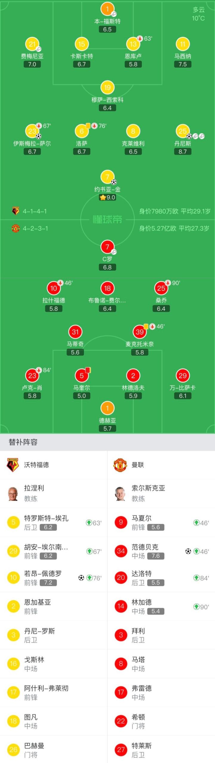 沃特福德首发:1-本-福斯特、11-马西纳、13-恩库卢(62'特罗斯特-埃孔)、15-卡斯卡特、21-费梅尼亚、19-穆萨-西索科、25-丹尼斯、8-克莱维利、6-洛萨(76'10-若昂-佩德罗)、23-伊斯梅拉-萨尔(68'29-胡安-埃尔南德斯)、7-约书亚-金