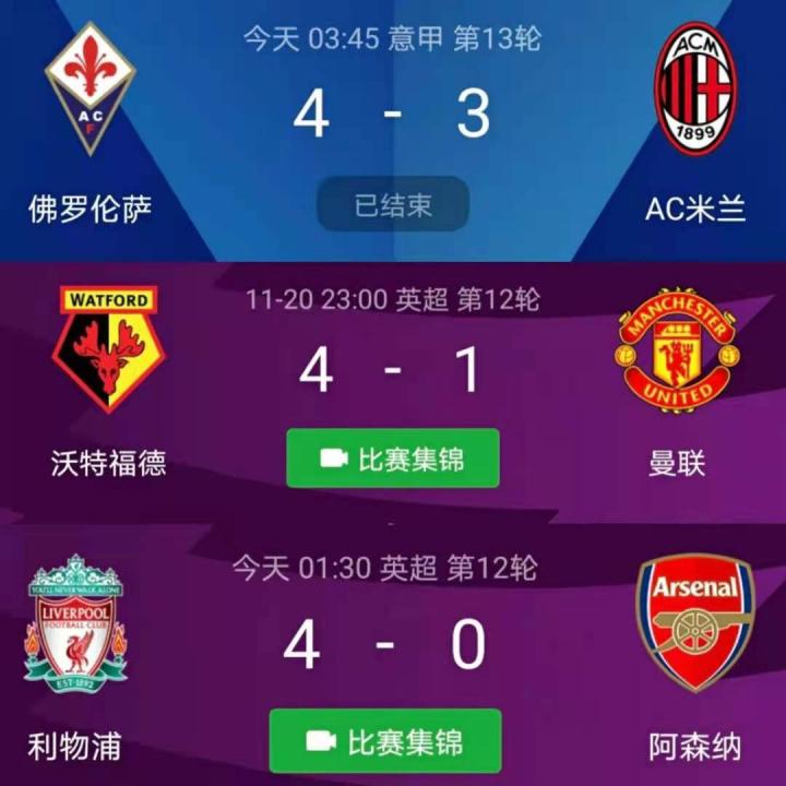 在首先进行的比赛中,曼联客场1-4不敌沃特福德;随后进行的比赛中,阿森纳则是在安菲尔德遭遇了0-4的溃败;而在最后进行的意甲比赛中,米兰3-4憾负佛罗伦萨,吞下了本赛季意甲的首场失利。