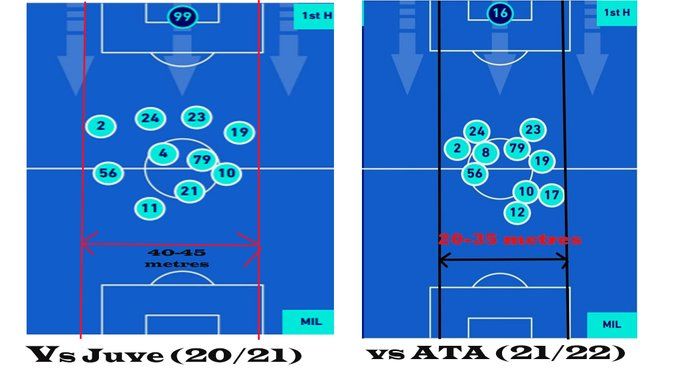 不同的还包括米兰比上赛季阵型变得更加狭窄。对于想要施压的球队来说,缩小场地宽度是非常必要的,而缩小宽度会给对手更少的操作空间,并让米兰有机会主宰比赛方式。