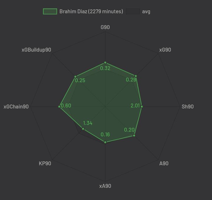 从他的数据来看,尤其是参与进攻预期(xGchain90),可以看出布拉欣在米兰的比赛中有多么投入。