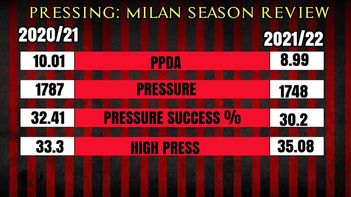 米兰的PPDA(每个防守动作前的传球数)为8.99,这在欧洲联赛中是一个非常高的标准,比上赛季的10.01还好。当然,这个赛季还有很多比赛要打,所以情况可能会改变。