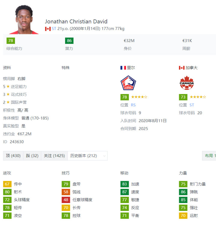 在FIFA22中,戴维的能力为78、潜力为86,他有4项能力值达到80+,其中跑位和射术为80、沉着为81、加速和最大速度分别为83和87、体能和弹跳分别为85和86。